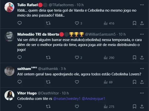Por fim, com o time cada vez mais com “a cara” de Tite, o Flamengo vai crescendo e se colocando como um dos times mais competitivos da América do Sul. Inclusive, o nome de Cebolinha foi amplamente elogiado nas redes sociais.