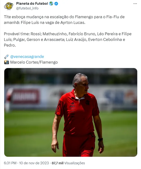 Isso porque o técnico Tite chegou no time e conseguiu botar o Urubu de volta nos áres do Rio. Com os tropeços do Botafogo, o Flamengo briga agora para encostar na liderança e ao menos uma mudança deve ocorrer para o Fla x Flu: Ayrton Lucas vai sair.