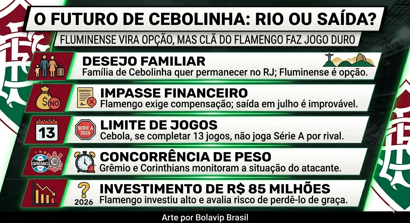 Com o Flamengo exigindo compensação financeira, uma saída na próxima janela vai se tornando cada vez mais difícil. Cebola, se completar 13 jogos no Brasileirão, fica impedido de atuar na Série A de 2026 por outro clube.