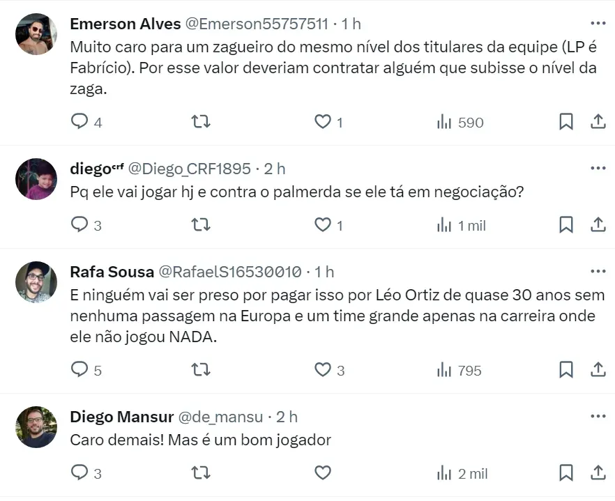 Segundo os dois profissionais, o Flamengo está mais perto dos valores pedidos pelo Massa Bruta. A proposta flamenguista deve ficar entre 8,5 e 9 milhões de euros (R$ 45 milhões e R$ 48 milhões na cotação atual) e será levada aos paulistas por meio do empresário Paulo Pitombeira, que cuida da carreira de Ortiz.