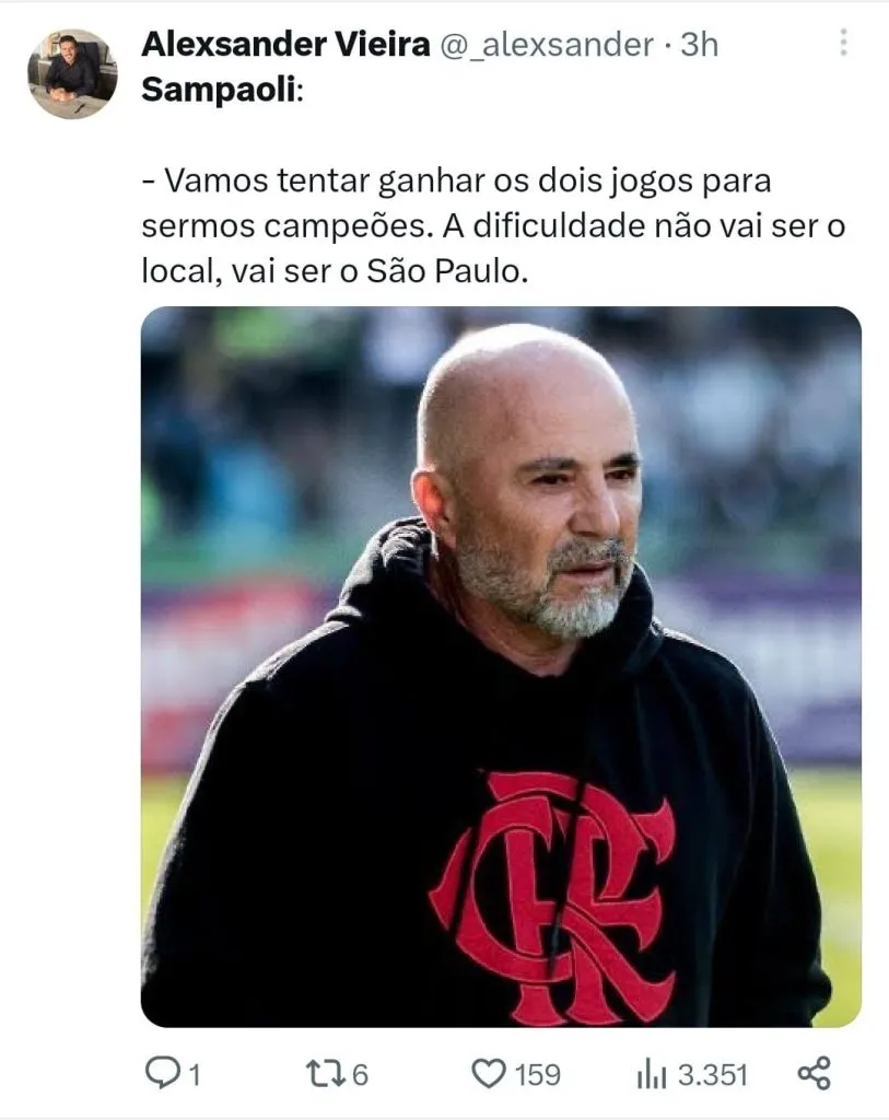 “Eu acho que a única chance do Flamengo é se ele trocar de técnico agora, domingo vai jogar com o Botafogo, se perder, se tomar uma sapatada, eu poderia apostar que o Flamengo trocará de técnico nesse momento. O Flamengo não tem mais nada, o trabalho do Sampaoli já acabou, para quem tinha alguma dúvida, basta ver o sorteio da Copa do Brasil, os jogadores do Flamengo em volta do Dorival e o Sampaoli lá atrás, parecia ninguém, estava lá com uma cara de abandonado, ninguém está nem aí mais para o Sampaoli, esse trabalho claramente já acabou”, afirmou no UOL News Esporte.