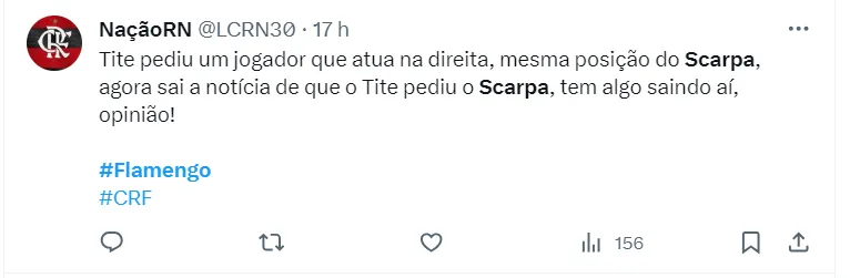 De acordo com informações do jornalista Júlio Miguel Neto, Tite sinalizou a diretoria do Flamengo o desejo de ter Gustavo Scarpa no elenco para o próximo ano. A posição do atleta é uma das prioridades no mercado, o que poderia facilitar um acerto.