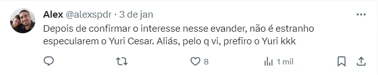 Como foi o caso do nome do atacante Yuri César, do Shabab Al Ahli, dos Emirados Árabes Unidos. O nome do jogador foi ventilado nos bastidores, mas a diretoria descarta a contratação.