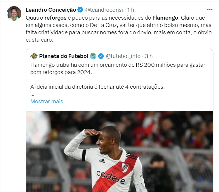 A intenção é a montagem de uma equipe forte, que tenha condições de brigar por títulos importantes, deixando a temporada atual para trás. E com isso, se aproxima de finalizar uma negociação. Isso porque, River Plate definiu sobre De La Cruz e Flamengo foi informado de imediato.