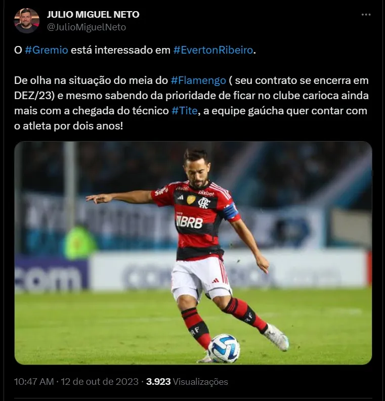 Com o fim do contrato com o Flamengo, que encerra em dezembro, e com as negociações estagnadas, o Grêmio vê a possibilidade de convencer o jogador a atuar no Clube. Mas, com a chegada de Tite, que já convocou Everton Ribeiro para a Seleção, pode acabar atrapalhando os planos do Imortal. A diretoria adota cautela nessa situação e vem acompanhando de perto buscando convencer o jogador.