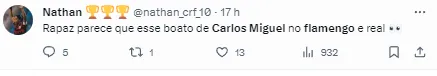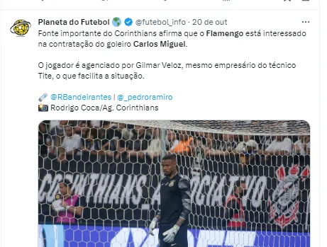 Um nome que já foi alvo de especulações e que pode pintar no Flamengo no ano que vem é o do goleiro Carlos Miguel, reserva de Cássio no Corinthians e xodó da Fiel. No momento, além de Rossi, o Rubro-Negro tem Santos e Matheus Cunha.