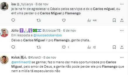 “Diante dessa informação, o Carlos Miguel já falou lá dentro: ‘Eu quero jogar. E eu sei que com o Cássio, eu não vou poder jogar nesse momento’. Há um movimento para que o Carlos Miguel deixe o Corinthians”, iniciou o jornalista no programa Opinião Placar.