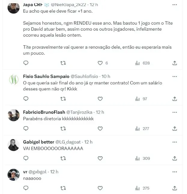 “Com vínculo com o Flamengo até dezembro de 2024, David Luiz tem o desejo de cumprir o contrato com o clube. Caso o Rubro-Negro tenha a intenção de se desfazer do zagueiro ao término desta temporada, terá que convencê-lo a fazer isso”, afirmou o jornalista em seu canal no YouTube.