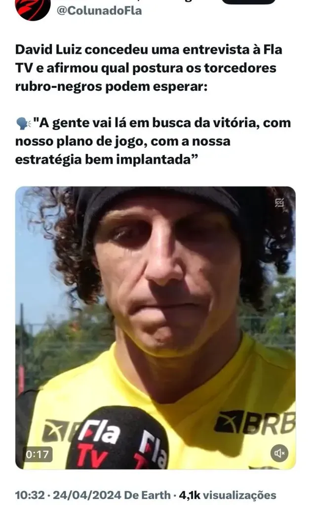 Apesar disso, David Luiz fez uma projeção otimista para a Nação, afirmando que a equipe vai em busca da vitória: “A gente vai lá em busca da vitória. Com o nosso plano de jogo e com a nossa estratégia bem implantada”, disse em vídeo postado pela Coluna da Fla.