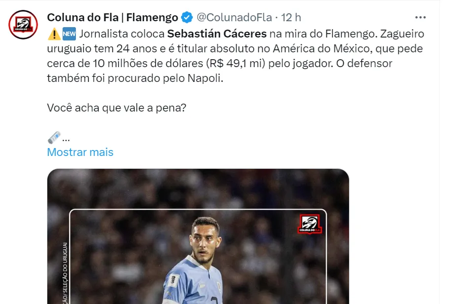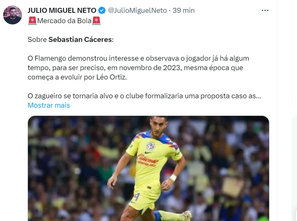 Tottenham, Wolverhampton e Brentford também têm Cáceres na pauta para 2024. No começo do mês, jornalistas mexicanos cravavam o zagueiro no América pelos próximos seis meses, mas uma oferta do Flamengo pode mudar tudo.