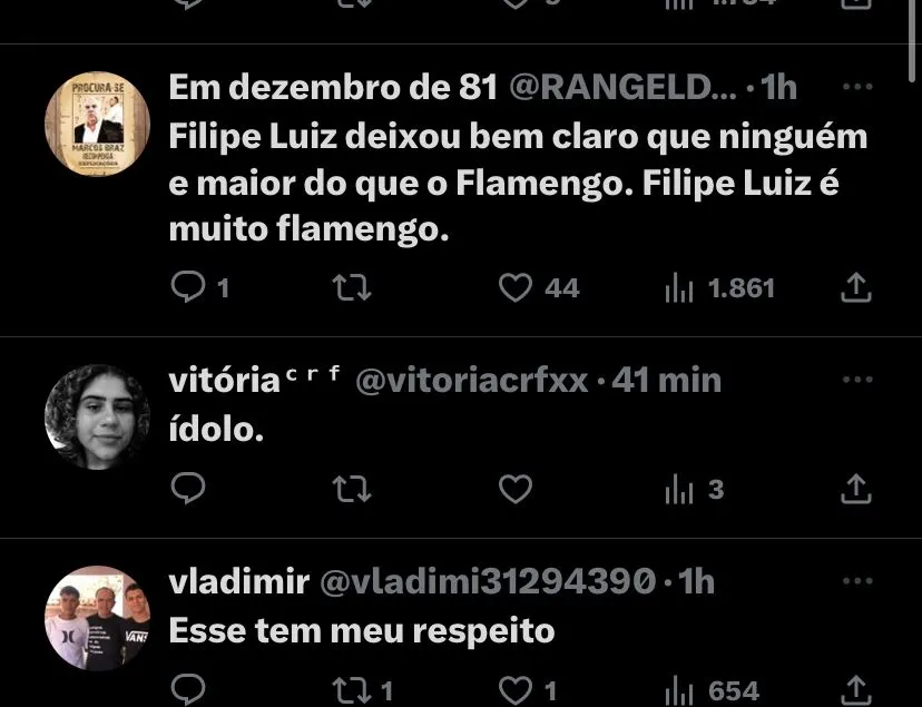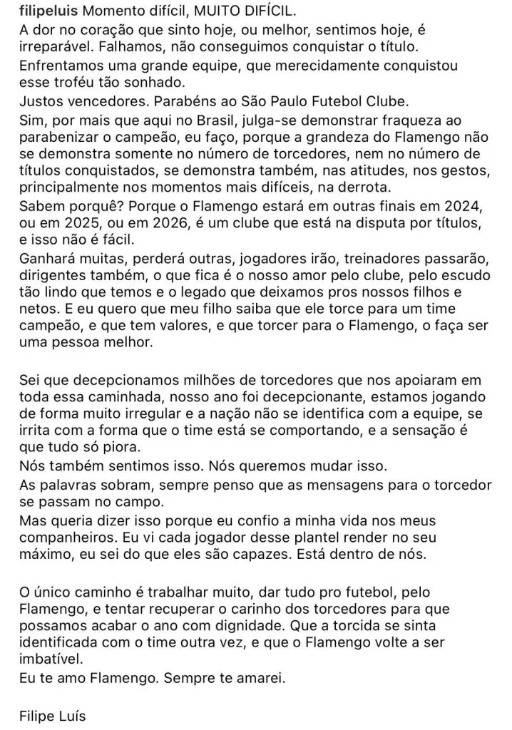 Filipe Luís ainda deu o ‘caminho certo’ para esse momento do Rubro-Negro: “O unico caminho é trabalhar muito, dar tudo pro futebol do Flamengo, e tentar recuperar o carinho dos torcedores para que possamos acabar o ano com dignidade. Que a torcida se sinta identificada com o time outra vez, que o Flamengo volte a ser imbatível. Eu te amo Flamengo. Sempre te amarei”, finalizou o jogador.
