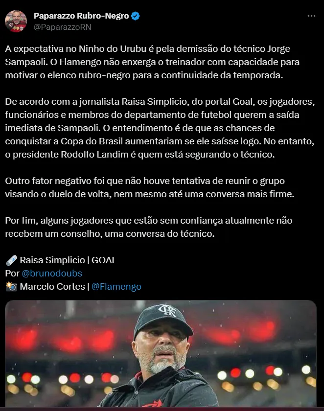 “Os jogadores, funcionários e membros do departamento de futebol querem a saída imediata de Sampaoli. O entendimento é de que as chances de conquistar a Copa do Brasil aumentariam se ele saísse logo. No entanto, o presidente Rodolfo Landim é quem está segurando o técnico. Outro fator negativo foi que não houve tentativa de reunir o grupo visando o duelo de volta, nem mesmo até uma conversa mais firme.” Revelou a comunicadora.