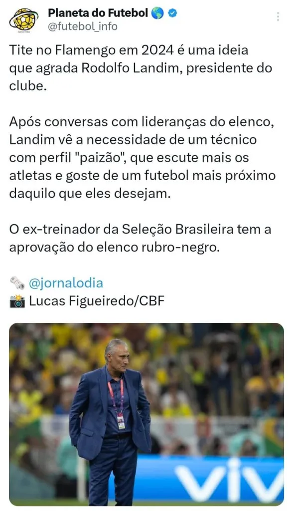 O ex-jogador ainda sugeriu o nome de Tite para substituir Sampaoli. “A pior coisa para jogador é acordar e pensar: ‘Puts, tenho que ir lá no Ninho do Urubu treinar com o Sampaoli e esses caras’. Assim, não ganha de ninguém. Para mim, tinha que ter tirado Sampaoli no domingo e ontem ter aparecido um novo treinador lá. Sabe por quê? Motiva quem está fora e quem está no time tem que mostrar para permanecer, dá uma mudada no ambiente. Tinha que chegar um cara de fora, que não está nesse ambiente. O que eu pensei? Tira o Sampaoli e bota o Tite, no domingo é outro time, o ambiente muda completamente. Se chega um Gallardo no Flamengo agora ou um Tite, toda essa confusão some instantaneamente”, indicou.