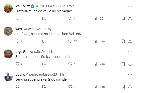 Eu gostaria de um dia, como diretor, não sei, mas gostaria de realizar alguma coisa no Flamengo. Se eu morrer sem fazer isso, vou morrer frustrado. A situação existe. Talvez um dia aconteça” , disse em entrevista à jornalista Raisa Simplicio.