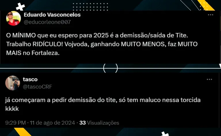 Desta forma, através das redes sociais, alguns torcedores já pedem a saída de Tite, entendendo que nesse período que o comandante está a frente da equipe a evolução não é satisfatória.