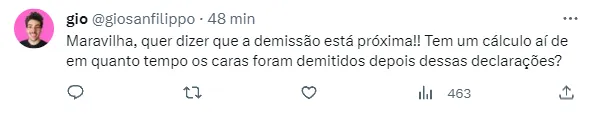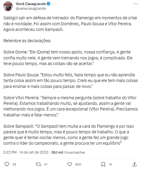 Por meio do Twitter, o setorista recuperou outras vezes que Gabigol defendeu treinadores do Flamengo em coletiva durante crises de resultados. Na amostragem, nomes como Domenec, Paulo Sousa e Vítor Pereira deram o ar da graça, provocando uma reflexão da Nação. Muitos adeptos concluíram que, talvez por coincidência, todos esses exemplos viriam a ser demitidos logo em seguida. Foi aí que a saída de Sampaoli foi defendida pelos populares.