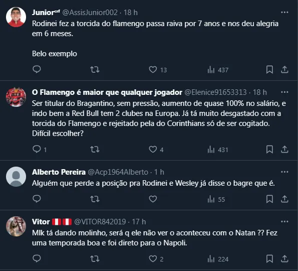 “Inspirado no Rodinei, de quem foi reserva por uma temporada sem brigar pela posição. As falhas clamorosas nos recentes jogos contra Fluminense (1-1) e Atlético Mineiro (0-3) confirmam a fonte de inspiração. Péssimo defensivamente!!!!”, publicou o jornalista.