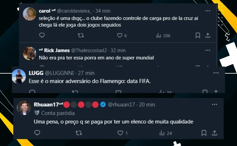 Por fim, embora o debate seja antigo, a maior parte dos flamenguistas foram até as redes sociais criticar a situação. Uma das situações mais questionadas foi a de Nicolás De La Cruz, que está fazendo controle de carga no Fla e corre o risco de se lesionar na Celeste Olímpica. Veja os comentários: