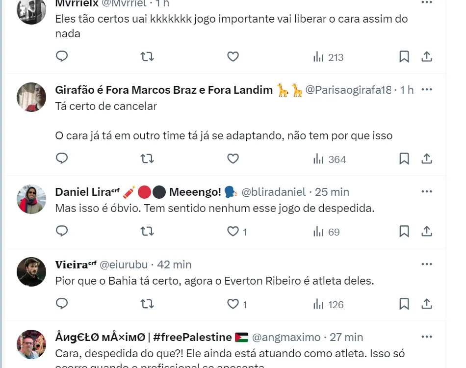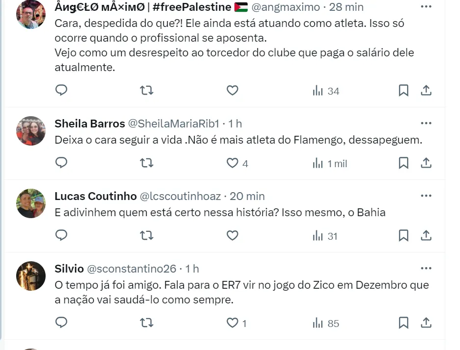Nos comentários do tuíte do setorista do Mengão, grande parte dos torcedores rubro-negros condenam a ideia de uma despedida de ER. Para essa parcela, seu tempo no Clube já foi encerrado e isso é um ‘desrespeito’ com o Bahia, sua nova equipe.