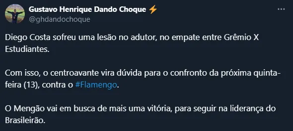 Isso porque um dos principais jogadores do Clube Gaúcho sentiu uma lesão no adutor no jogo contra o Estudiantes e se tornou dúvida para o confronto contra o Mais Querido. Trata-se de Diego Costa.