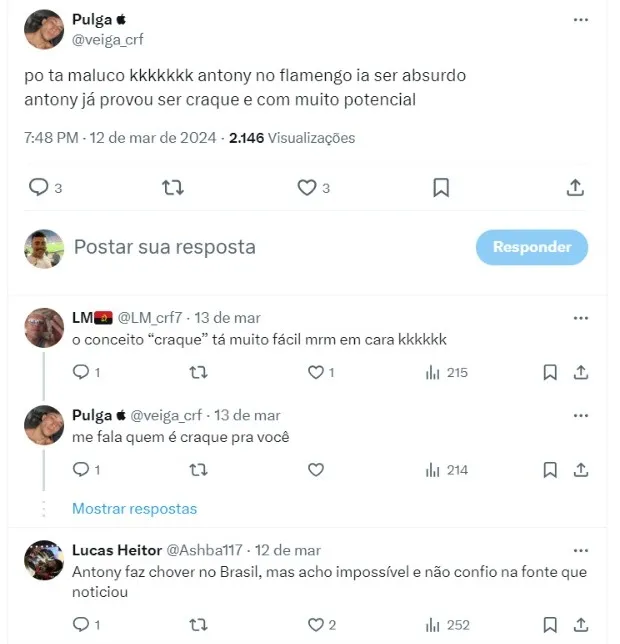 Segundo informações do jornalista Venê Casagrande, um dirigente do Flamengo, que não teve seu nome revelado pelo comunicador, nega interesse na contratação de Antony, do Manchester United.