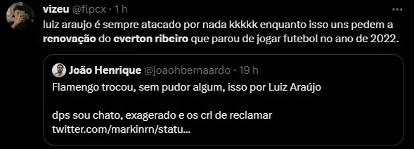“Ele quer contrato até 50 anos? O estafe do Everton Ribeiro que se dane. Se eu sou dirigente: ‘Vem cá, estafe. Se tá zangado, eu retiro a proposta… vai o estafe, o Everton Ribeiro e todos pro inferno’. Para com isso”, finalizou, no programa Canelada.