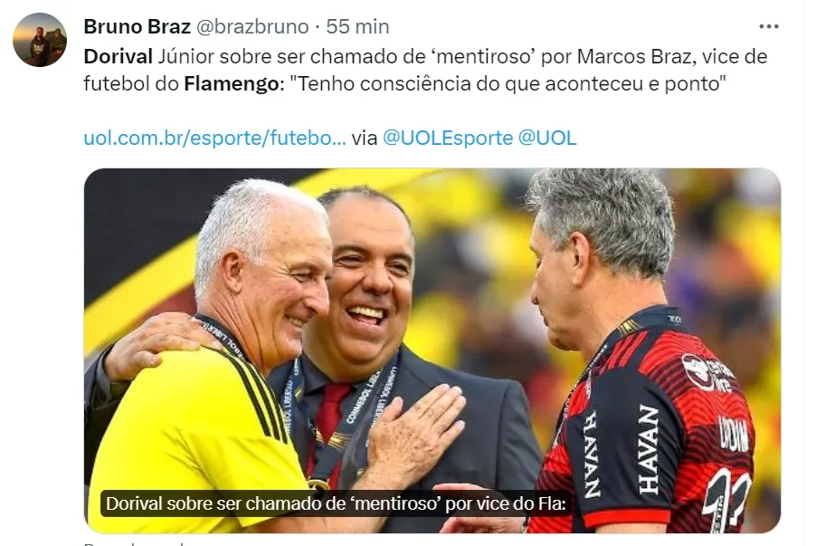 Dorival falou pela primeira vez sobre a declaração do vice de futebol do Flamengo, Marcos Braz, que o chamou de “mentiroso” após dar sua versão sobre a data de reapresentação pós-férias dos jogadores enquanto o treinador comandava o Rubro-Negro.