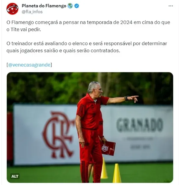 Segundo ele, o Flamengo começará a pensar na temporada de 2024 em cima do que o Tite vai pedir.