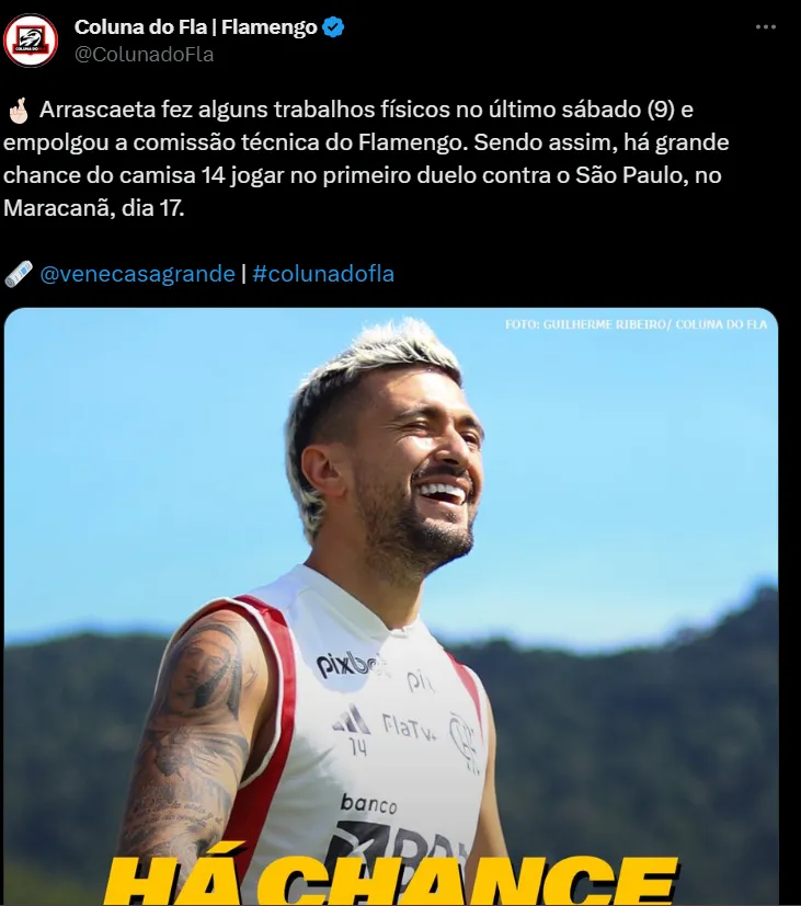 “Arrascaeta, que está “dando a vida” na recuperação da lesão muscular para ficar à disposição de Sampaoli na final da Copa do Brasil, fez alguns trabalhos físicos no campo, no último sábado. O meia, inclusive, correu e mostrou evolução na recuperação.” Falou o comunicador em suas redes sociais.