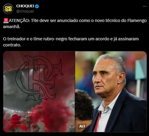 O Flamengo chegou a um acordo com Tite neste domingo, confirmando-o como o novo treinador do clube, de acordo com o GE. A oficialização desse acordo está prevista para acontecer na segunda-feira. A negociação envolveu uma longa reunião entre Marcos Braz, vice de futebol do clube, e Gilmar Veloz, representante do técnico, que conseguiram superar os últimos obstáculos financeiros.