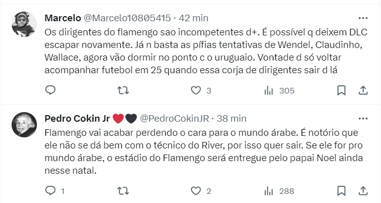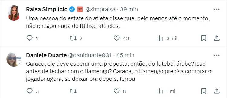 Entretanto, uma oferta vantajosa dos principais clubes da Arábia Saudita como: Al Hilal, Al Nassr, Al Ittihad, ou da Europa podem fazer o jogador mudar de ideia e recuar quando a atuar no Flamengo. O Mengão enfrenta o Bragantino, nesta quinta-feira (23).