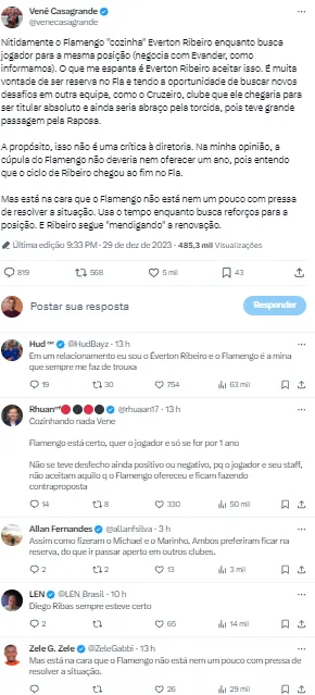 “Nitidamente o Flamengo ‘cozinha’ Everton Ribeiro enquanto busca jogador para a mesma posição (negocia com Evander, como informamos). O que me espanta é Everton Ribeiro aceitar isso. É muita vontade de ser reserva no Fla e tendo a oportunidade de buscar novos desafios em outra equipe, como o Cruzeiro, clube que ele chegaria para ser titular absoluto e ainda seria abraço pela torcida, pois teve grande passagem pela Raposa”, escreveu em suas redes sociais.