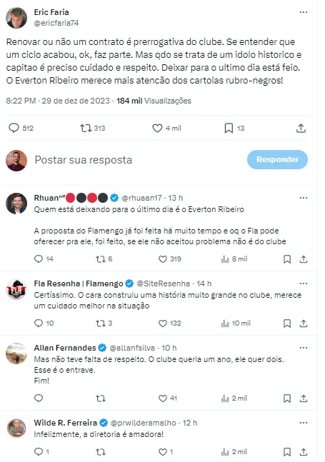 “Renovar ou não um contrato é prerrogativa do clube. Se entender que um ciclo acabou, ok, faz parte. Mas quando se trata de um ídolo histórico e capitão é preciso cuidado e respeito. Deixar para o ultimo dia está feio. O Everton Ribeiro merece mais atenção dos cartolas rubro-negros!”, publicou o jornalista.