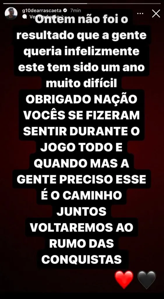 “Ontem não foi o resultado que a gente queria infelizmente. Este tem sido um ano muito difícil. OBRIGADO NAÇÃO VOCÊS SE FIZERAM SENTIR DURANTE O JOGO TODO E QUANDO MAIS A GENTE PRECISOU. ESSE É O CAMINHO, JUNTOS VOLTAREMOS AO RUMO DAS CONQUISTAS ❤️🖤”, escreveu.