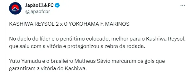 O Kashiwa Reysol venceu o Yokohama FM, pela 26ª rodada da J1 League (liga nacional do país asiático), por 2 a 0. Na partida, Sávio acabou marcando o gol de misericórdia. Ele acabou convertendo, de pênalti, o segundo tento do Aurinegro, aos 38 minutos do segundo tempo. Vale lembrar que o Yokohama é o atual líder da competição japonesa.