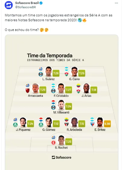 Sendo assim, a escalação de gringos ficou da seguinte forma: Sergio Rochet (Uruguai – Internacional), Emanuel Brítez (Argentina – Fortaleza), Arboleda (Equador – São Paulo), Gustavo Gómez (Paraguai – Palmeiras) e Piquerez (Uruguai – Palmeiras); Villasanti (Paraguai – Grêmio), Arrascaeta (Uruguai – Flamengo), Cristaldo (Argentina – Grêmio) e Jhon Arias (Colômbia – Fluminense); Suárez (Uruguai – Grêmio) e Cano (Argentina – Fluminense).