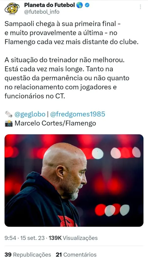 O Flamengo sofreu uma derrota amarga diante do Athletico-PR às vésperas do jogo de ida da final da Copa do Brasil. A equipe rubro-negra foi goleada por 3 a 0 e voltou a abalar a confiança do torcedor que havia ficado esperançoso depois do triunfo no clássico contra o Botafogo. Para o jornalista Mauro Cezar Pereira, o técnico Jorge Sampaoli foi um dos principais responsáveis pelo revés do Flamengo. Segundo ele, o treinador sabotou o time.