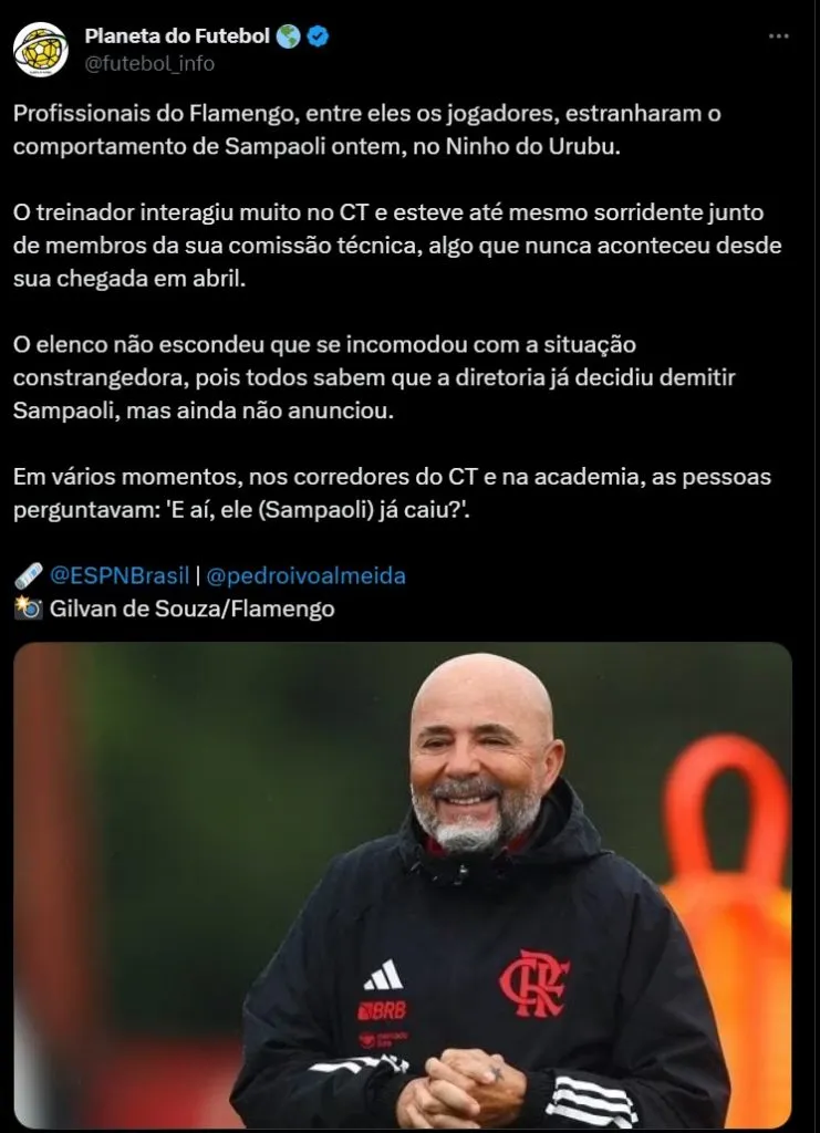Vale destacar, inclusive, que de acordo com informações do jornalista Pedro Ivo Almeida, o elenco não escondeu o incômodo com a situação constrangedora. Já que todos sabem sob a não permanência de Sampaoli, mas a gestão ainda não oficializou. O comunicador ainda revelou que em vários momentos, nos corredores do centro de treinamento, os funcionários se questionavam se o argentino já havia ‘caído’.