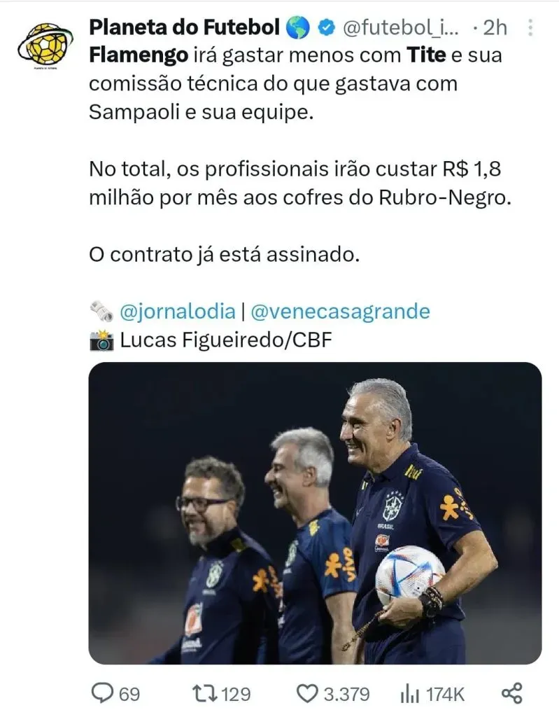 O Flamengo chegou a um acordo e pode estar muito próximo de anunciar oficialmente, Tite como novo treinador. O vice de futebol do clube, Marcos Braz, ainda confirmou que Tite já estará no Ninho do Urubu na terça-feira (10). A chegada de Tite divide opiniões, há quem acredite que o experiente ex-técnico da Seleção terá sucesso na Gávea, todavia existem aqueles que não estão tão otimistas com a chegada do treinador.