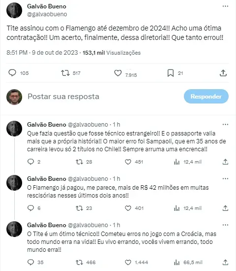 “Tite assinou com o Flamengo até dezembro de 2024!! Acho uma ótima contratação!! Um acerto, finalmente, dessa diretoria!! Que tanto errou!! Que fazia questão que fosse técnico estrangeiro!! E o passaporte valia mais que a própria história!! O maior erro foi Sampaoli, que em 35 anos de carreira levou só 2 títulos no Chile!! Sempre arruma uma encrenca!! O Flamengo já pagou, me parece, mais de R$ 42 milhões em multas rescisórias nesses últimos dois anos!! O Tite é um ótimo técnico!! Cometeu erros no jogo com a Croácia, mas todo mundo erra na vida!! Eu vivo errando, vocês vivem errando, todo mundo erra!!”, publicou Galvão Bueno.