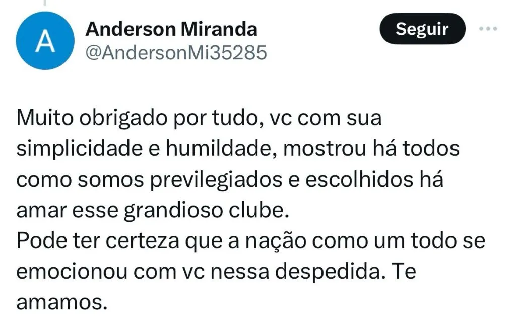 “Há uma enorme contradição entre as palavras do, agora, ex-jogador, que rasgou elogios aos colegas, mesmo em péssima fase; e a realidade, aquilo que o seu time derradeiro apresentou em 2023. Incrível que, mesmo sendo uma das principais lideranças, não tenha demonstrado inconformismo. Sem falar nos 42 dias de férias, que minimizou na coletiva”, concluiu.