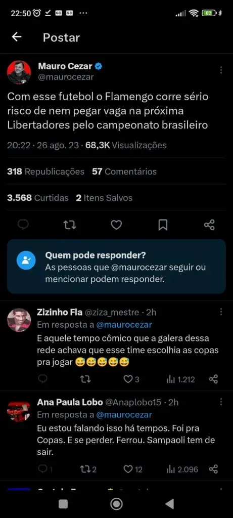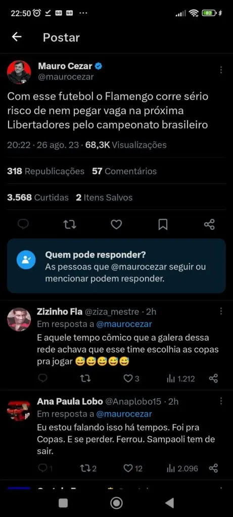 O jornalista Mauro Cezar Pereira fez uma previsão polêmica sobre o Flamengo e agitou os flamenguistas na web. “Com esse futebol o Flamengo corre sério risco de nem pegar vaga na próxima Libertadores pelo campeonato brasileiro”, cravou Mauro. O comentário repercutiu bastante, com a torcida do Fla endossando a opinião do cronista esportivo.