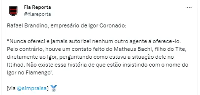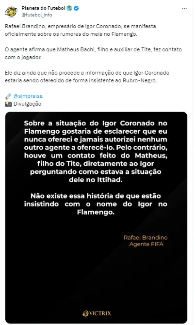 “Nunca ofereci e jamais autorizei nenhum outro agente a oferecê-lo. Pelo contrário, houve um contato feito do Matheus Bachi, filho do Tite, diretamente ao Igor, perguntando como estava a situação dele no Ittihad”, revelou o agente.