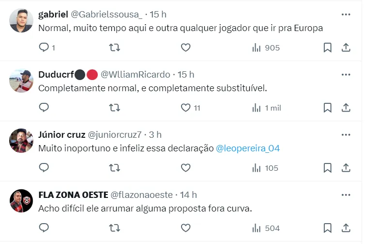 Quem entrou no radar para deixar a equipe carioca foi o zagueiro Léo Pereira, que se consolidou entre os titulares e é visto como uma peça fundamental do esquema tático de Tite. Ele vem vivendo um dos melhores momentos da carreira com a camisa Rubro-Negra.