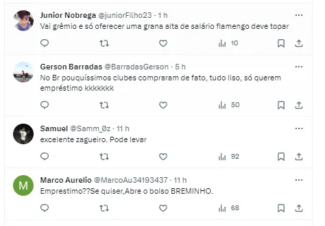 “A ideia do clube gaúcho, é pleitear um empréstimo do defensor com o rubro-negro carioca, por uma temporada”, informou o jornalista Julio Miguel Neto sobre a ideia de negociação do time gaúcho para o ano que vem.