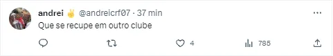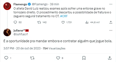 Mesmo demonstrando apoio ao atleta, uma parte da torcida do Flamengo aproveitou a situação para pedir a saída de David Luiz. O jogador está no final do contrato com o Mais Querido, a ser encerrado em dezembro deste ano e pode se despedir no término da temporada. Campeão da Libertadores e da Copa do Brasil de 2022, o zagueiro não conseguiu manter o alto nível em 2023, recebendo muitas críticas. Uma decisão ainda deve ser tomada, mas para agora, o jogador já encontra motivos para lamentar com a lesão.
