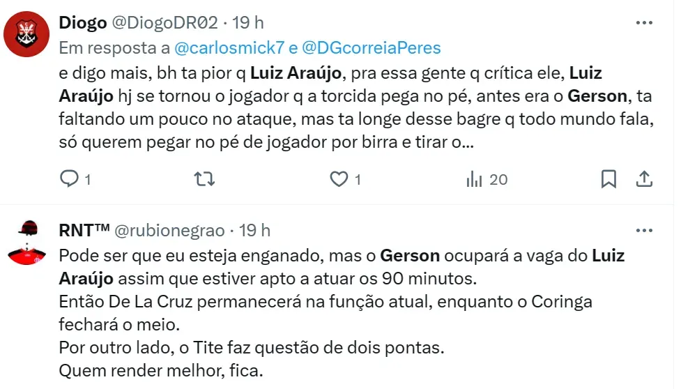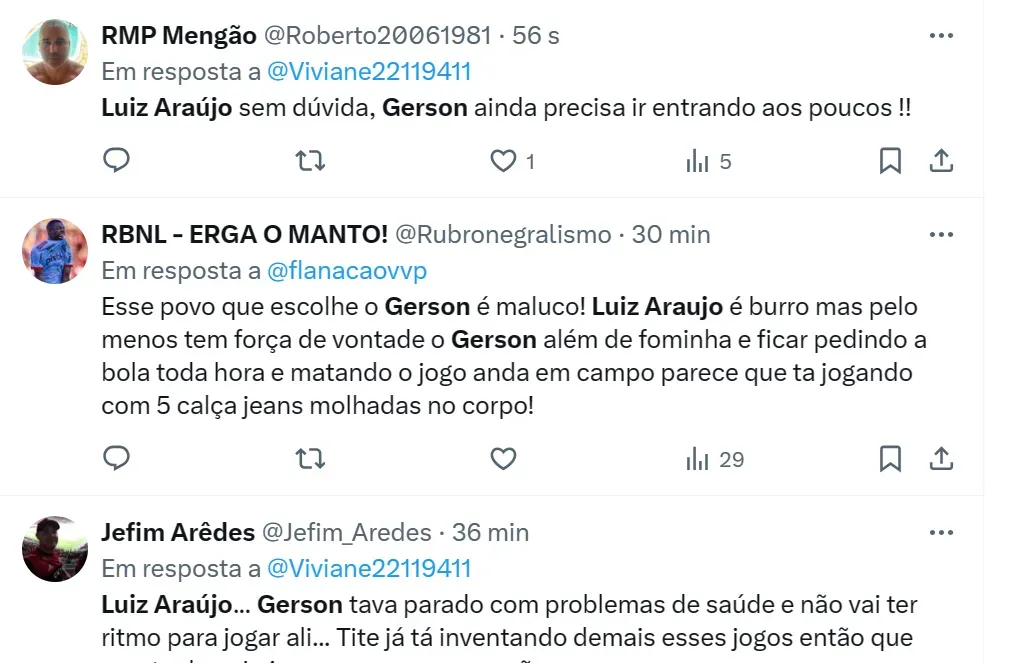 Para quem acreditava no retorno de Gerson entre os titulares, Tite mantém a calma. Na equipe titular que vai a campo contra o São Paulo, Luiz Araújo será mantido entre os 11 iniciais.