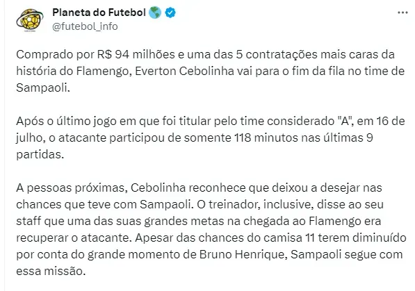 Trata-se do atacante Everton Cebolinha. O jogador foi adquirido no ano passado por R$ 13,5 milhões de euros (R$ 69,8 milhões na cotação da época), mas acabou nunca deslanchando no Mais Querido. Ele chegou a atuar bastante com Sampaoli, mas com a volta de Bruno Henrique após longo tempo machucado e a contratação de Luiz Araújo, ele acabou esquecido.