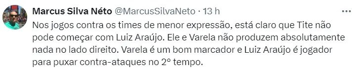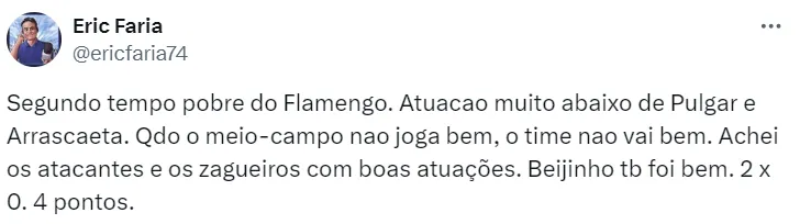 “Segundo tempo pobre do Flamengo. Atuação muito abaixo de Pulgar e Arrascaeta. Quando o meio-campo não joga bem, o time não vai bem. Achei os atacantes e os zagueiros com boas atuações. Beijinho (Ayrton Lucas) também foi bem. 2 x 0. Quatro pontos”, publicou Eric nas redes sociais.