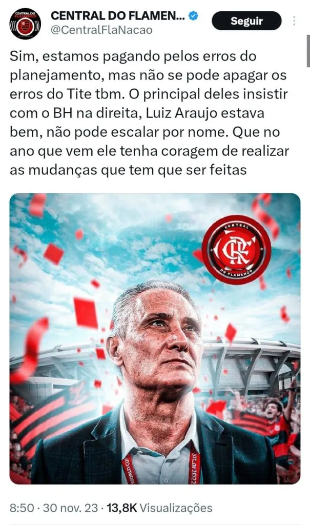 “Problemas já tinham aparecido diante do América. E estourou tudo ontem no Maracanã. Em resumo: Tite mexeu no que estava dando certo. E imagino só os que pediram a volta de BH ao time depois de 25 minutos bem diante do Bragantino. Sabem nada!”, completou.